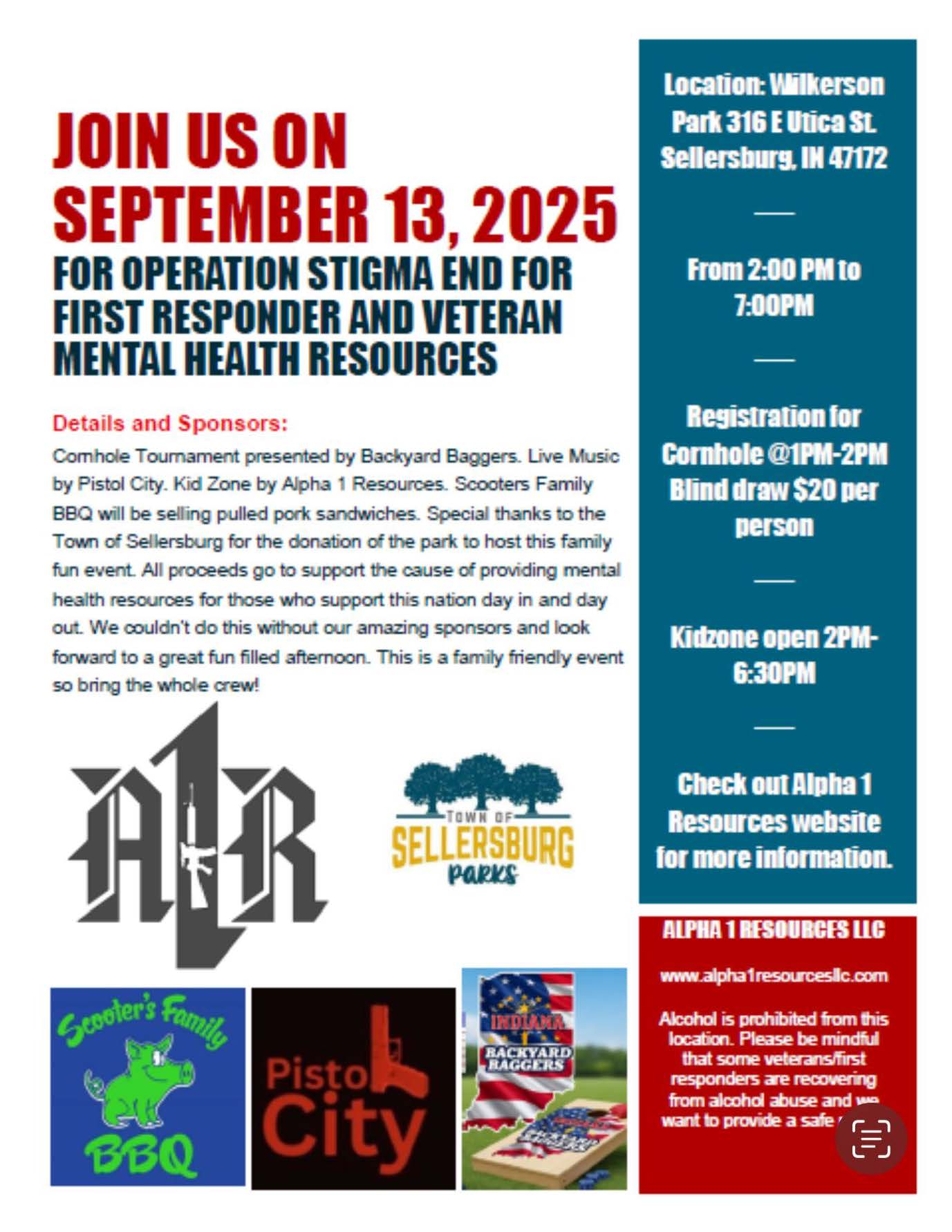 The Town of Sellersburg Parks has partnered with Alpha 1 Resources to host a 1st Responders and Veterans mental health benefit.